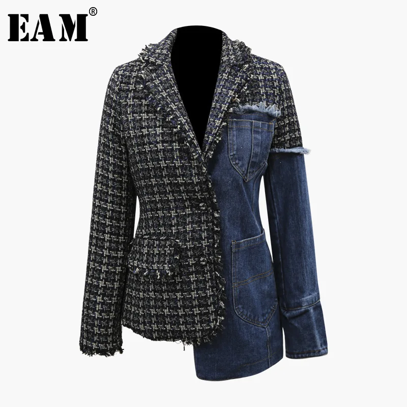 Kopen Goedkoop [EAM] 2018 Nieuwe Herfst Winter Revers Logn Mouw Wollen Shining Betaald Split Joint Denim Onregelmatige Jas Vrouwen Mode tij JK331 Online